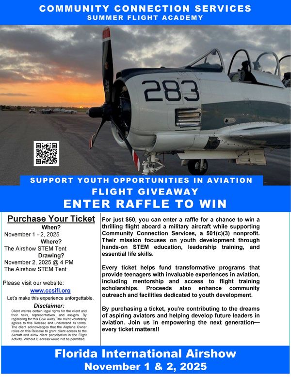 For just $50, you can enter a raffle for a chance to win a thrilling flight aboard a military aircraft while supporting Community Connection Services, a 501(c)(3) nonprofit. Their mission focuses on youth development through hands-on STEM education, leadership training, and essential life skills.